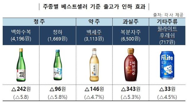 기준판매 비율이 적용되면 청하 출고가(1천669원)는 96원(5.8%), 백세주 출고가(3천113원)는 146원(4.7%) 내려갈 것으로 국세청은 예상했다. 백화수복 출고가(4천196원)는 242원(5.8%) 인하된다.