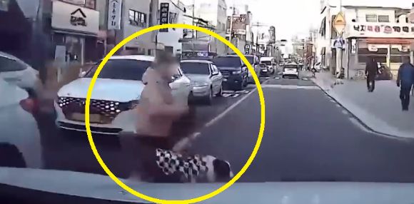 차에 치여 인도쪽으로 밀려난 여성은 곧바로 쪼그려 앉아 반려견 얼굴을 쓰다듬으며 다친 곳이 없는지 확인했다.