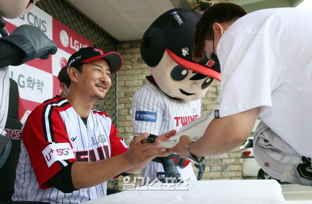 "3일 오후 서울 잠실야구장에서 열리는 LG트윈스와 롯데자이언츠와의 경기에 앞서 은퇴식을 갖는 박용택이 팬사인회를 하고 있다. 잠실=김민규 기자