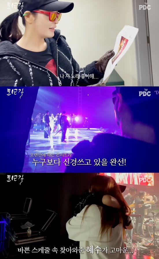 영상에는 2023년 11월, 김완선의 콘서트가 열리는 장충체육관을 찾은 김혜수의 모습이 담겼다. 깜짝 게스트 출연을 앞두고 대기실을 찾은 김혜수는 이효리, 화사 등이 게스트로 출연하는 큐시트를 확인하면서 "게스트들 화려하다 다 내가 좋아하는 분들"이라고 이야기했다.