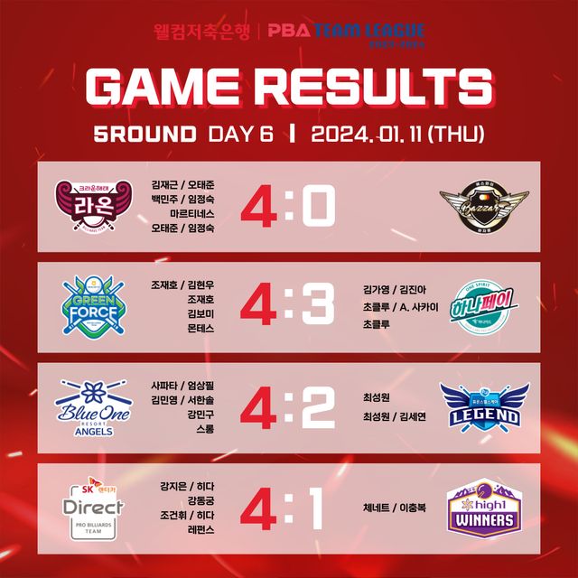 11일 경기도 고양시 ‘고양 킨텍스 PBA 스타디움’에서 열린 ‘웰컴저축은행 PBA 팀리그 2023-24’ 5라운드 6일차에서 SK렌터카와 블루원리조트는 하이원리조트와 휴온스를 각각 세트스코어 4-1, 4-2로 꺾고 승점3을 추가했다. 이로써 두 팀은 정규라운드 전체 공동 3위(승점53)로 올라서며 포스트시즌 진출에 한 걸음 다가섰다.
