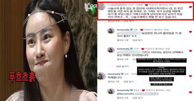 때문에 '나솔사계' 방송 이후 일부 시청자들은 조현아 SNS에 악플을 남기기 시작했습니다. 한 누리꾼은 "나솔사계 혼자 감도 못 잡던데 시대착오적이면서 1도 안 웃긴 멘트 칠 거면 하차 좀 하세요. 안 그래도 과거 논란들 때문에 보기 좀 부답스럽고 거북스러운데 '남아 선호 사상', '남자가 하늘이다' 어쩌고. '나솔사계'에서 제발 안 보고 싶습니다"라는 댓글을 남겼습니다.