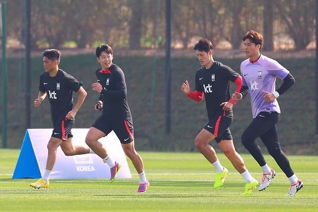 当地时间11日上午,在卡塔尔多哈的阿尔埃格拉训练场,包括孙兴慜(左二)在内韩国队球员正在进行恢复训练。【图片来源 韩联社】