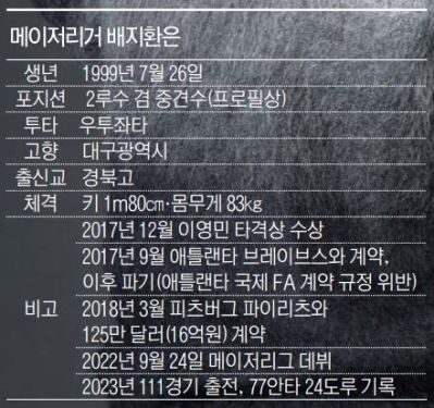 2024년은 빅리거 배지환의 롱런 여부를 가늠할 고비가 될 전망이다. 고등학교 졸업 후 미국에 직행한 선수들의 성공 확률은 점점 낮아지고 있다. KBO리그 MVP 출신으로 최근 샌프란시스코 자이언츠와 계약(6년 1억1300만 달러·1468억원)한 이정후 사례와 맞물려 배지환의 행보는 더욱 눈길을 끈다. 배지환은 "(고졸 직행 선수들의 실패가 많다는) 인식을 바꾸고 싶다"고 말했다.