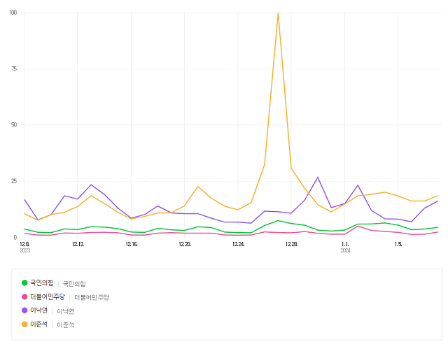 제3지대 세력에 대한 대중의 관심사는 거대 양당과 맞먹는 수준이다. 검색어 트랜드 분석 서비스 네이버 데이터랩에 따르면 지난 9일부터 최근 1개월 동안 '제3지대' '빅텐트'에 대한 검색은 '국민의힘' '민주당'에 한참 떨어진다. 하지만 '이낙연' '이준석' 검색은 두 양당보다 높은 검색 수준을 보인다. 이 위원장이 국민의힘을 탈당한 지난해 12월 27일 '이준석' 검색 수치는 가장 높은 100까지 치솟았다.