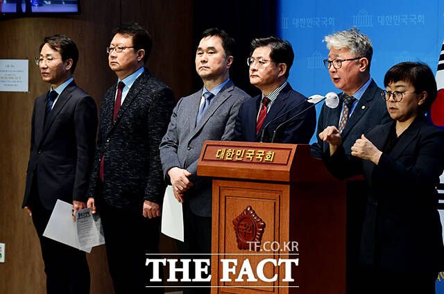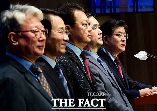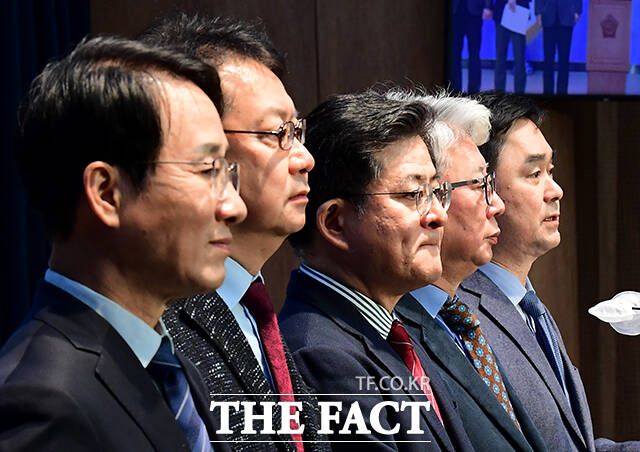 [더팩트ㅣ국회=배정한 기자] 더불어민주당 탈당을 선언한 '원칙과상식' 의원들이 12일 오전 서울 여의도 국회 소통관에서 '미래대연합' 창당 선언 기자회견을 하고 있다.
