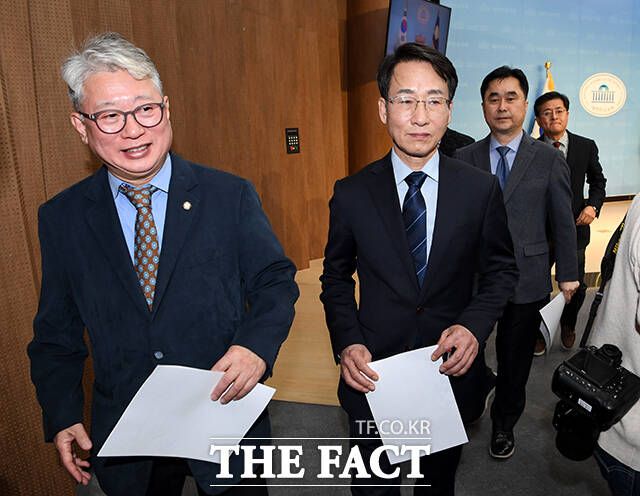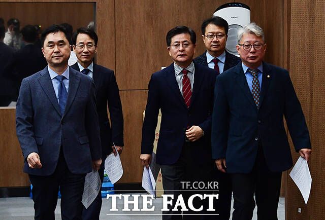 기자회견장 들어서는 김종민 의원, 이원욱 의원, 박원석 전 정의당 의원, 정태근 전 한나라당 의원, 조응천 의원(왼쪽부터).