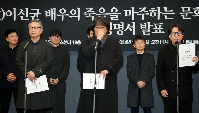 배우 김의성, 봉준호 감독, 가수 윤종신 등 문화예술인이 12일 오전 서울 중구 한국프레스센터에서 고(故)이선균 배우의 죽음을 마주하는 문화예술인들의 성명서를 발표하고 있다. 문화예술인 연대회의는 지난 12월27일 작고한 고(故)이선균 배우의 안타까운 죽음을 마주하며 다시는 이런 일이 반복되어서는 안 된다는 데 뜻을 같이 하고 수사 당국 관계자들의 철저한 진상규명 촉구, 언론의 자정 노력과 함께 보도 목적에 부합하지 않는 기사 삭제 요구, 문화예술인 인권 보호를 위한 현행 법령 재개정 등을 요구 했다. / 뉴스1