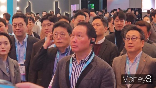 최태원 SK그룹 회장도 SK 계열사 통합 전시관인 'SK원더랜드'를 시작으로 삼성전자, LG전자 부스를 차례로 살폈다.