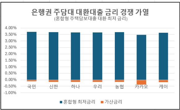 은행들은 금리 경쟁이 가열되자 마진까지 낮췄다. 4대 시중은행의 혼합형 주담대 대환 시 가산금리는 마이너스 0.10%p~0.16%p다. 케이뱅크도 마이너스(-) 0.19%p다. 카카오뱅크의 경우 마이너스(-) 0.361%p로 시중은행보다 가산금리가 두 배 이상 낮다.
