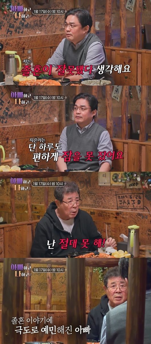 사위와 만난 자리에서 백일섭은 "어디서 틀어졌지?"라고 고민을 토로했고, 사위는 "저는 졸혼이 잘못됐다고 생각한다"라고 밝혔다. 이어 "아버님 딸 지은이는 아버님이 졸혼 선언을 하고 이제까지 단 하루도 편하게 잠을 못 잤다. 차라리 이혼이면 아예 남남인데, 졸혼은 부부로서 하나의 끈이 남아있는 것이지 않냐"라고 솔직한 생각을 전했다.