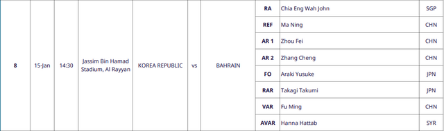AFC는 바레인전 주심에 중국 심판진을 배정했다. 주심에 마닝, 제1 부심에 주페이, 제2 부심에 장청, VAR 심판에 푸밍, 어시스턴트 VAR 심판엔 시리아 국적의 한나 하탑이 경기를 관장한다. 대기심에는 아라키 유스케(일본) 심판이 배정됐다.