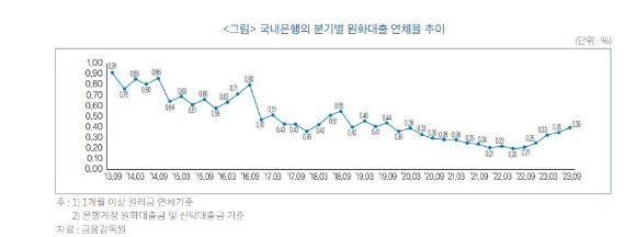 국내 은행의 분기별 연체율도 지속적인 하락세를 보이다가 2022년 6월 말 0.20%를 기록한 후 지속적인 상승세로 돌아섰다. 지난해 9월 말에는 0.39%까지 올랐다.