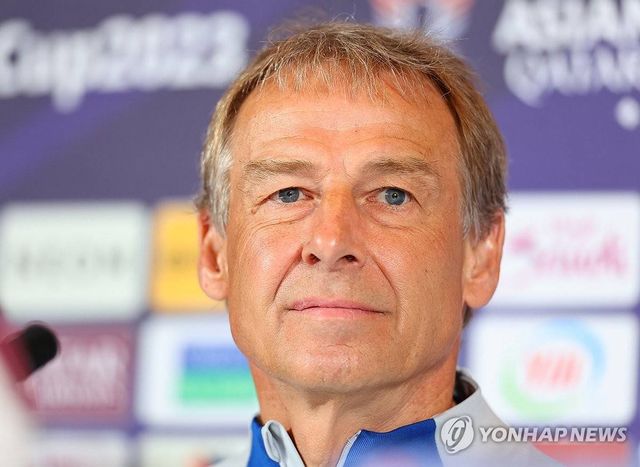 대한민국 축구 대표팀 위르겐 클린스만 감독이 2023 아시안컵 바레인과의 경기를 하루 앞둔 14일(현지시간) 오후 카타르 도하 메인미디어센터(MMC)에서 공식 기자회견을 하고 있다 / 연합뉴스
