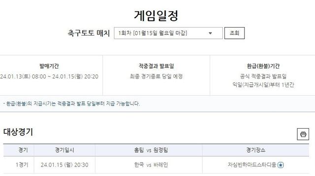 양팀의 전반 및 전·후반 득점을 맞혀야 하는 축구토토 매치 1회차는 지난 13일(토) 오전 8시 발매를 개시했으며, 경기 시작 10분 전인 15일 오후 8시20분까지만 구매가 가능하다.