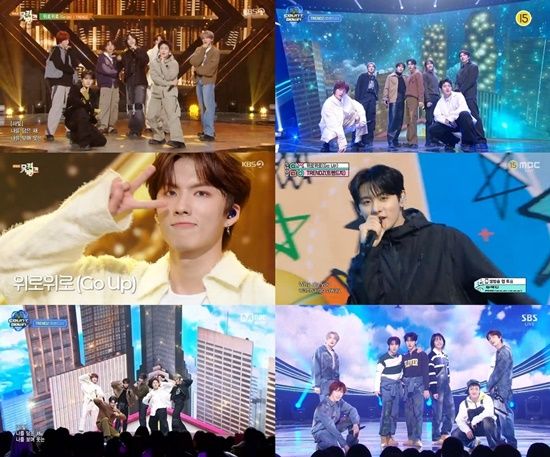 트렌드지(하빛, 리온, 윤우, 한국, 라엘, 은일, 예찬)는 지난 11일 Mnet ‘엠카운트다운’을 시작으로 KBS2 ‘뮤직뱅크’, MBC ‘쇼! 음악중심’, SBS ‘인기가요’에 출격, 신곡 ‘위로위로 (Go Up)’ 무대를 꾸몄다.