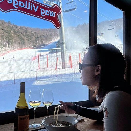 공개한 사진에는 강원도 평창에 위치한 애견 동반 스키장에 방문한 공효진 모습이 담겨있다. 창밖을 바라보며 식사하고 공효진 모습에 외로움이 느껴진다.