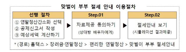 이를 통해 근로자는 간소화자료를 활용한 예상세액을 계산할 수 있고, 맞벌이 부부는 자녀·부모님 등 부양가족 공제조합을 시뮬레이션해 세금부담이 가장 낮은 경우를 선택할 수 있다. 다만 맞벌이 부부는 본인의 공제신고서를 이용해 절세안내를 받을 배우자의 인적사항 기재 및 자료 제공에 동의해야 한다.