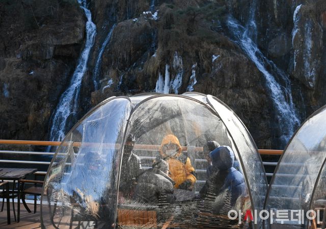 전국 곳곳에 한파가 찾아온 15일 오전 서울 서대문구 홍제천 카패 폭포에 설치된 투명 이글루 안에서 시민들이 추위를 피하고 있다. 이날 기상청은 북서쪽에서 찬 공기가 내려오면서 아침 기온이 전날 대비 2~8도가량 떨어지겠다고 예보했다. /정재훈 기자
