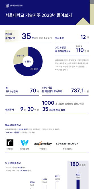 서울대학교 기술지주가 2023년의 성과 자료를 공개했다. 당사는 지난해 총 35개 스타트업을 대상으로 110억 원의 투자를 집행하였으며, 얼어붙은 벤처투자 분위기 속에서도 성장 가능성이 높은 유망 초기기업에 적극적인 투자를 이어 나갔다. 특히 성장지원뿐만 아니라 후속 투자를 집행하며 기존 포트폴리오의 성장에 힘을 실었다.