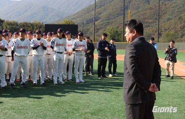 10월 상동구장에서 열린 김태형 감독과 선수단 상견례. 이때 사직구장은 잔디 교체 공사 중이었다. 사진=구단 제공