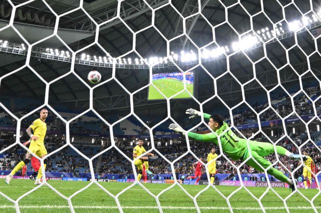 말레이시아 골키퍼가 16일 요르단과의 AFC 아시안컵 조별리그 1차전에서 상대 슈팅 선방을 시도하고 있다. AFP=연합뉴스