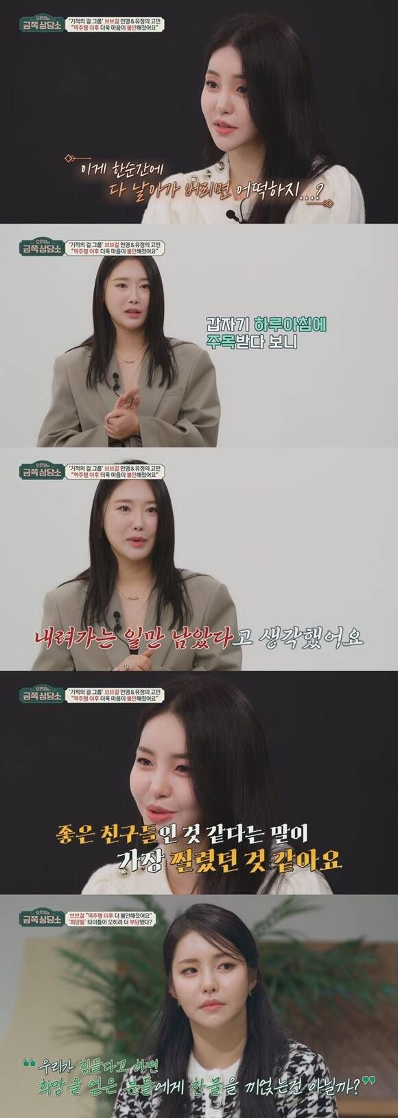 16일 방송 예정인 채널A 예능프로그램 '오은영의 금쪽 상담소'에는 브브걸 민영과 유정이 "역주행 이후 불안해졌다"는 고민으로 출연한다.