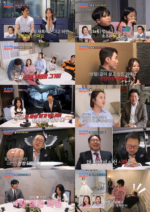 ‘조선의 사랑꾼’에서 ‘有자녀 돌싱커플’ 김슬기♥유현철이 아이들과 함께 단란한 생일파티를 진행했다. 또, ‘국민 딸바보’ 이용식의 딸 이수민♥원혁 커플은 부모님들과 첫 상견례를 마무리했다.