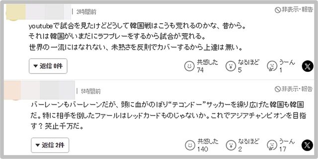 한 네티즌은 "유튜브에서 경기를 봤지만 어째서 한국전은 이렇게 옛날부터 거친 걸까. 한국은 아직도 과격한 플레이를 하기 때문에 경기가 거칠다. 세계의 일류가 될 수 없는 미숙함을 반칙으로 커버하기 때문에 능숙하지 않다"라고 주장했다.