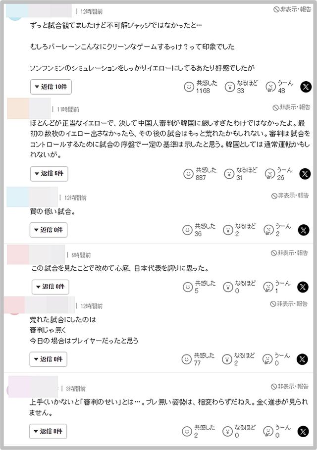 이런 일본 네티즌들의 비난 여론은 일본 SOCCER DIGEST 매체가 15일 공개한 ["중국인 주심이 경기를 망쳤다!" 한국 대표팀이 바레인에 고전한 원인은 "불가한 심판 때문"이라고 모국 미디어 규탄!] 보도의 댓글에서 많이 드러났다.