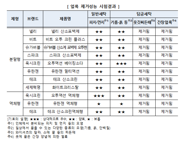 이외에 '유한젠 액체형'(유한양행)이 일반세탁과 담금세탁 방식에서 모두 가장 낮은 '보통' 평가를 받았고, 나머지 제품들은 모두 '양호'하다는 평가를 받았다. 찌든 때와 간장 얼룩에 대해서는 전 제품이 담금세탁 조건에서 모두 제거됐다.