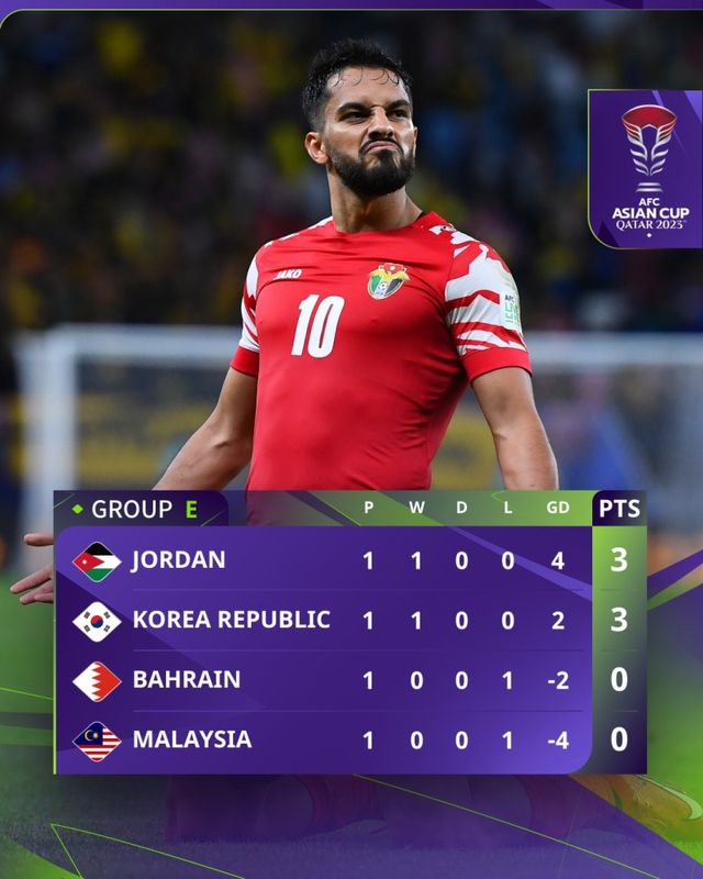 이어 열린 경기에서 요르단이 말레이시아를 4-0으로 대파하면서 한국은 조별리그 E조를 2위로 출발하게 됐다. 승점은 같지만 한국은 득실차가 +2, 요르단은 +4로 순위가 엇갈렸다. 그 뒤를 바레인(-2) 말레이시아(-4)가 잇고 있다.