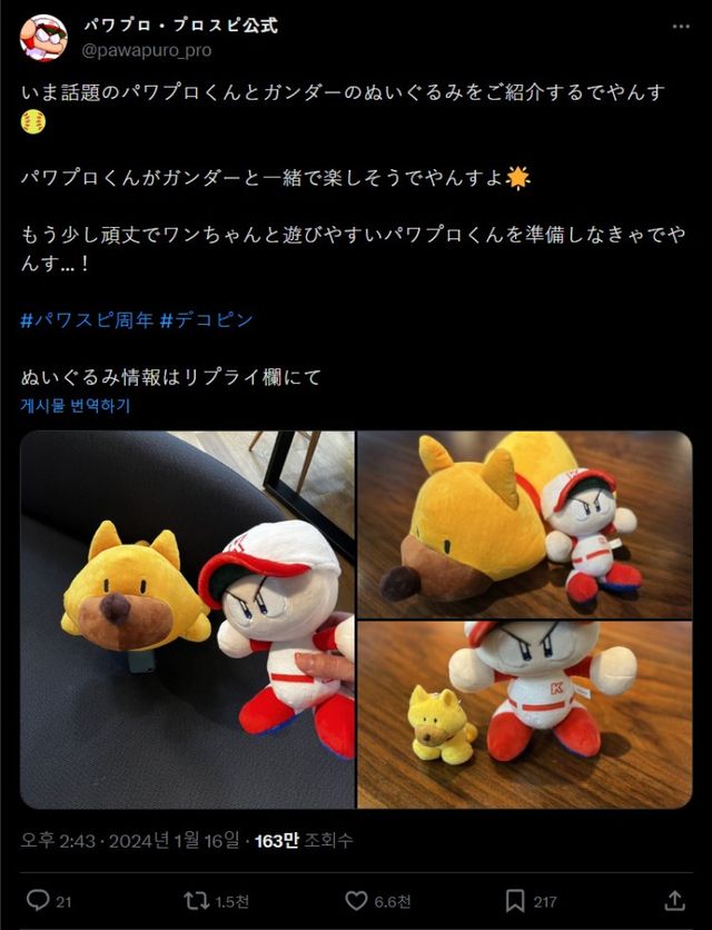 코나미는 파워풀 프로야구 공식 계정을 통해 "화제의 파워프로군(마스코트)과 건다(강아지 캐릭터)의 봉제 인형을 소개합니다"라며 "좀 더 튼튼하고 강아지와 놀기 쉬운 파워프로군을 준비하지 않으면 망가지겠네요"라고 전했다.
