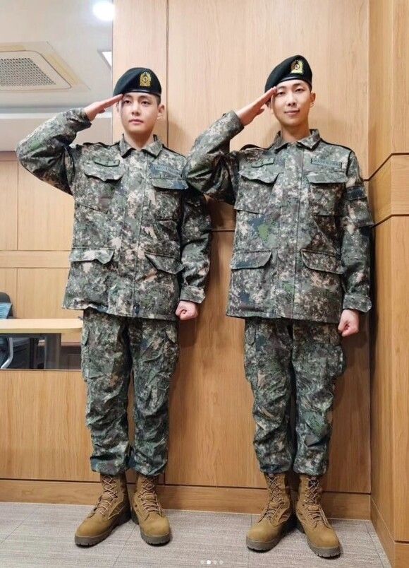 RM은 16일 자신의 인스타그램에 충남 논산 육군훈련소에서 열린 신병교육 수료식에서 뷔와 함께 참석해 경례를 하고 있는 사진을 공개했다. 더불어 '타의 모범이 되었다'는 내용이 적힌 표창 사진도 게재했다.