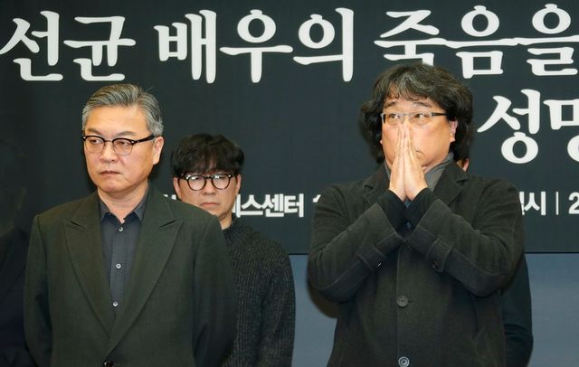 봉준호 감독을 비롯한 문화예술인들이 고(故)이선균 배우의 죽음을 마주하는 문화예술인들의 성명서를 발표하고 있다. / 뉴스1