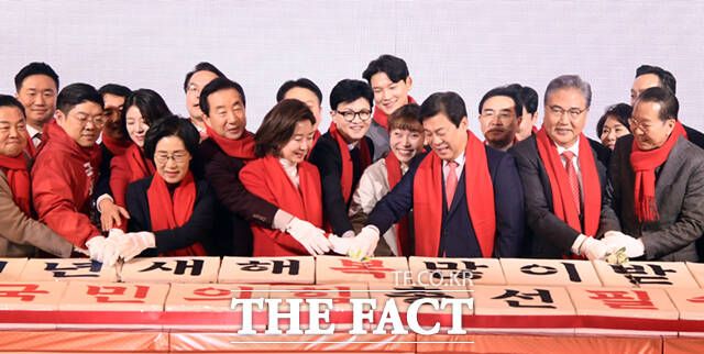 한동훈 국민의힘 비상대책위원장을 비롯한 서울시당 소속 의원들이 17일 오전 서울 마포구 케이터틀에서 열린 서울시당 신년인사회에 참석해 떡 커팅을 하고 있다.