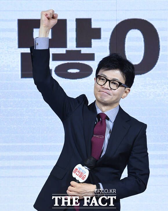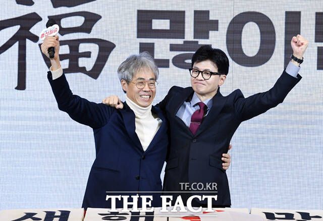 [더팩트ㅣ이새롬 기자] 한동훈 국민의힘 비상대책위원장(오른쪽)이 17일 오전 서울 마포구 케이터틀에서 열린 서울시당 신년인사회에서 마포을 출마 후보로 김경율 비대위원을 소개, 무대에 오른 김 비대위원과 함께 손을 들어보이고 있다.