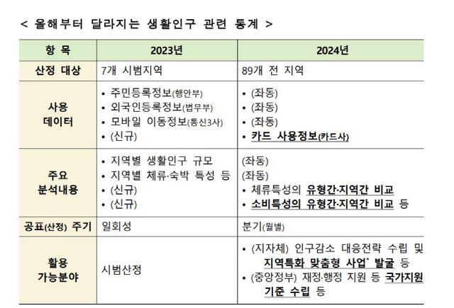 올해부터는 89개 인구감소지역 모두에서 조사한다. 정확하고 유용한 통계 산출을 위해 신용카드 사용 정보가 추가로 활용하며, 체류특성의 유형간·지역간 비교 및 소비특성의 유형간·지역간 비교도 실시한다. 또 공표주기도 분기별로 1년에 4차례 발표할 예정이다.