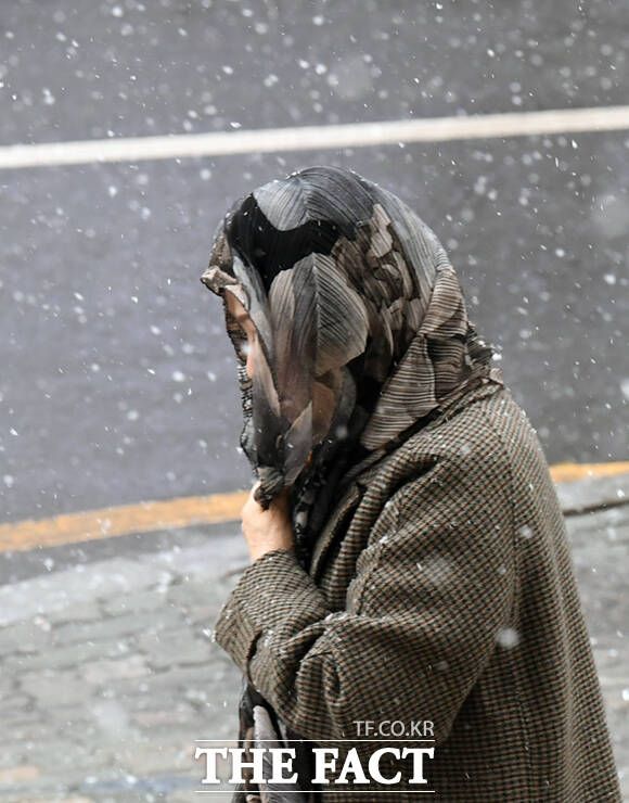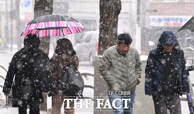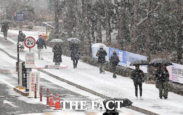 [더팩트ㅣ이새롬 기자] 전국에 눈 또는 비가 내리는 가운데, 17일 오후 서울 마포구 서강대학교에서 학생들이 눈을 맞으며 교정을 걷고 있다.