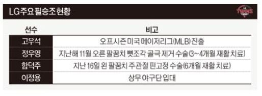 LG 마무리 투수였던 고우석(샌디에이고 파드리스)이 오프시즌 미국 메이저리그(MLB)에 진출했다. 또 다른 필승조 이정용은 입대했다. 지난해 11월에는 홀드왕 출신 정우영이 팔꿈치 뼛조각 수술을 받고 재활 치료 중이다. 불펜 공백이 작지 않은데 엎친 데 덮친 격으로 함덕주까지 이탈한 셈이다. 염경엽 감독은 "아쉽지만, 중간(불펜)에 누군가를 만들면 덕주가 돌아왔을 때 팀은 또 강해지는 거"라고 긍정했다.