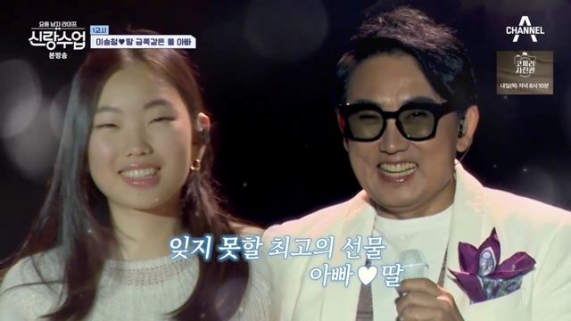 이날 공연 연습을 위해 아빠의 연습실을 찾은 딸 원이는 다소 긴장한 듯했지만, 이승철은 과거 원이와의 듀엣 무대 영상을 보여주며 능숙하게 분위기를 풀어나갔다. 남다른 부녀 케미를 자랑하던 두 사람은 붕어빵 노래 실력으로 환상적인 하모니를 선보였고, 이를 들은 ‘스튜디오 멘토 군단’은 진정한 슈퍼 DNA를 가진 부녀의 모습에 부러운 마음을 드러냈다.