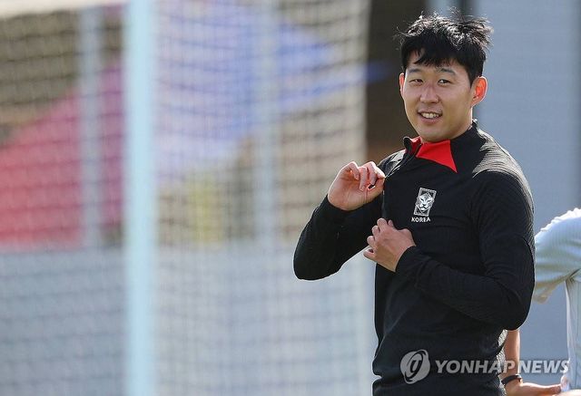 17일(현지시간) 카타르 도하 알에글라 훈련장에서 대표팀 주장 손흥민이 밝은 표정으로 훈련 준비를 하고 있다 / (도하=연합뉴스)