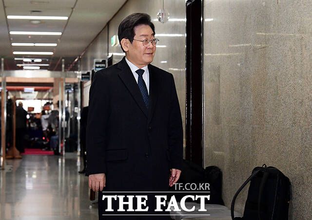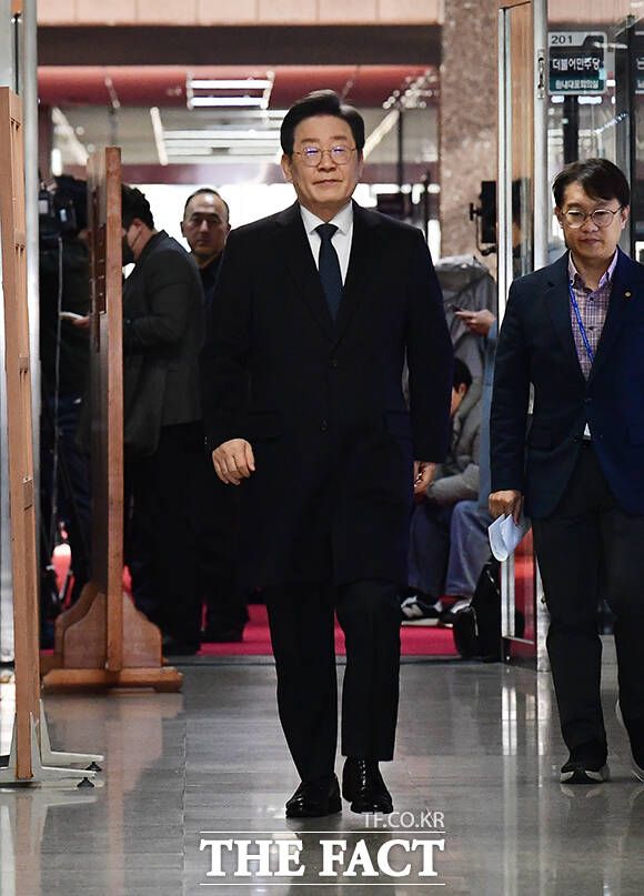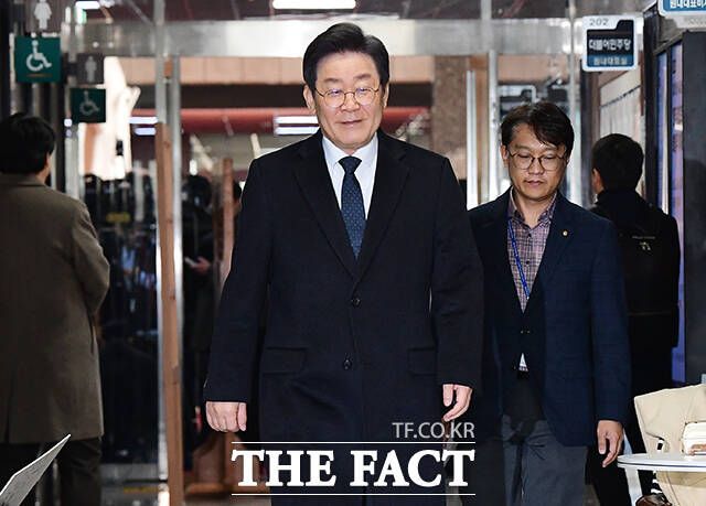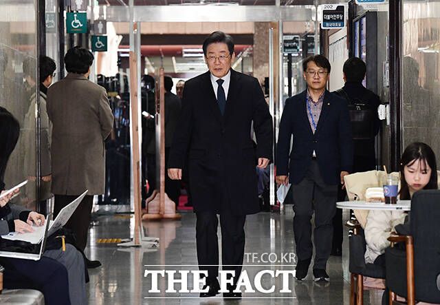 이재명 더불어민주당 대표(가운데)가 18일 오전 서울 여의도 국회에서 열린 '대한민국 생존을 위한 저출생 종합대책 발표'에 참석하기 위해 이동하고 있다. /국회=배정한 기자
