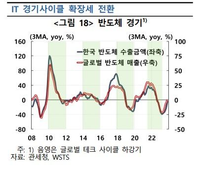 우리 경제도 IT 경기 반등에 힘입어 수출과 설비 투자를 중심으로 성장세가 확대될 전망이다. 예년 대비 부진했던 PC·스마트폰 교체 수요 및 AI 서버·데이터센터 투자 등이 반도체 수요를 견인할 것으로 예상했다. 설비투자도 반도체·이차전지·전기차 부문을 중심으로 회복세를 보일 전망이다.