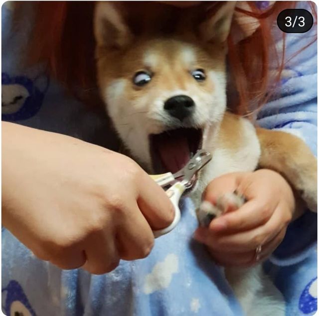 사진 속 시바견은 발톱을 자르는 게 겁이 났는지 입을 크게 벌리고선 눈을 희번덕거린다. 겁내는 표정이 어찌나 생생한지 호랑이라도 마주친 것처럼 보일 정도다.
