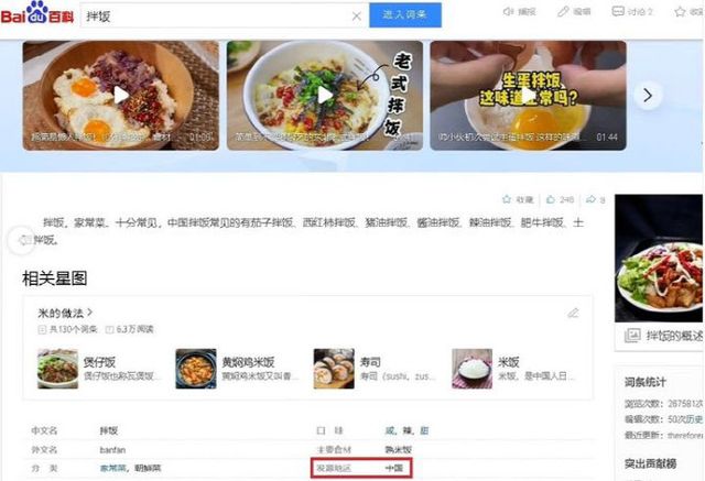 바이두 백과사전에는 비빔밥을 반판(拌飯)으로 소개하고 “중국의 가정식이고 흔히 볼 수 있는 것으로는 가지 비빔밥과 토마토 비빔밥, 간장 비빔밥 등이 있다”고 설명돼 있다. 그러면서 비빔밥을 ‘조선족 음식’으로 분류하고 발원지를 중국으로 표기했다.