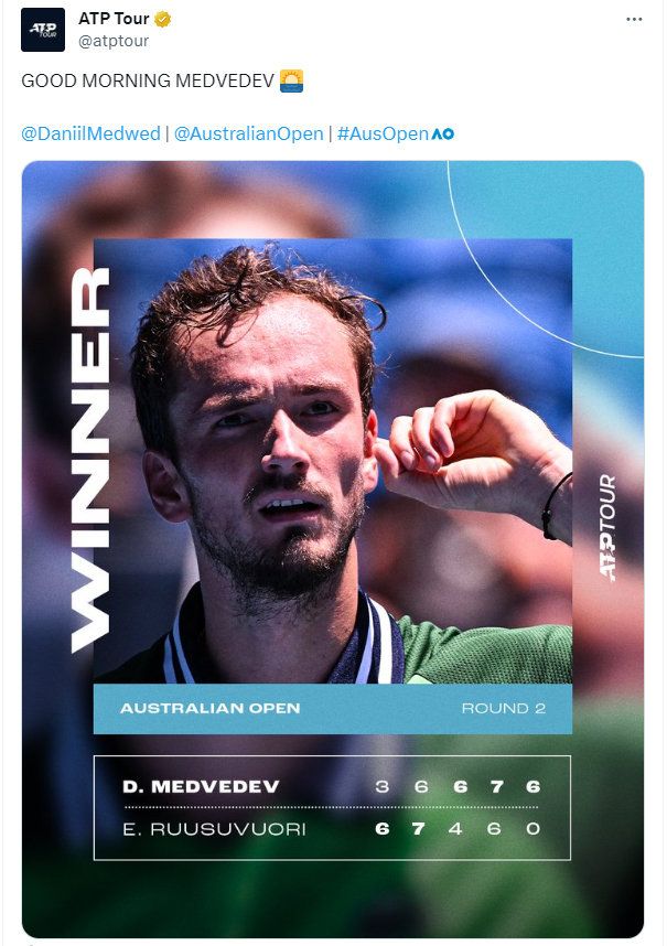 메드베데프는 이번 승리로 호주오픈 통산 23승7패를 기록했다. 그는 2021년과 2022년 결승에 진출했으나 각각 노바크 조코비치와 라파엘 나달에 막혀 우승 문턱에서 주저앉았다.