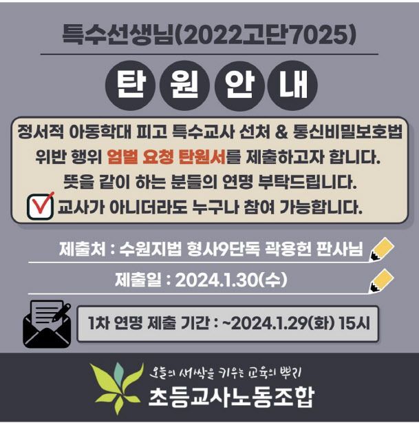 초등노조는 지난 17일 SNS를 통해 “정서적 아동학대 피고 특수교사 선처와 통신비밀보호법 위반 행위 엄벌 요청 탄원서를 제출하고자 한다”며 “뜻을 같이하는 분들의 연명 부탁드린다. 교사가 아니더라도 누구나 참여 가능하다”면서 탄원서 서명 링크를 올렸다.