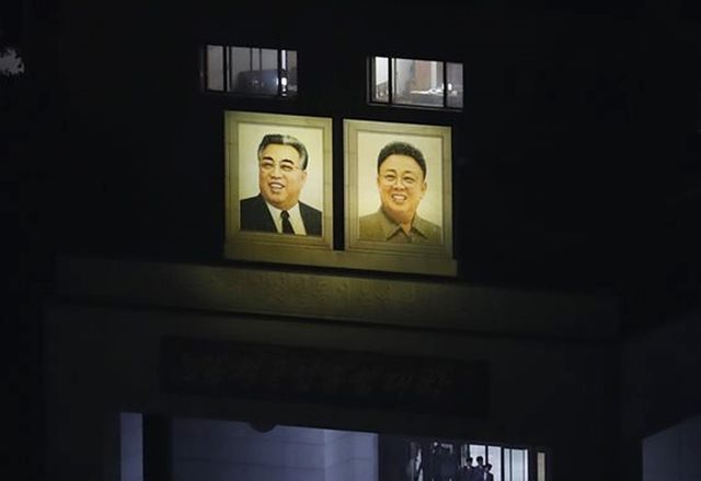 북한 평양 김책공업종합대학에 걸린 북한 김일성과 김정일의 초상화에 불이 밝혀져 있다. / 뉴스1-사진공동취재단