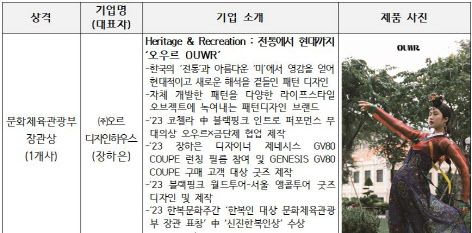 이날 서울 중구 문화역서울284에서 열리는 시상식에서는 우수 기업 중 블랙핑크의 한복 무대 의상을 제작하고 전통문양을 현대적으로 해석해 패션 상품을 개발한 오르디자인하우스가 문체부 장관상을 받는다.